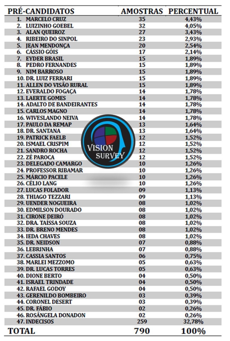 Segundo a pesquisa, se a eleição fosse hoje as nove primeiras colocações seriam dos deputados estaduais: Marcelo Cruz (4,43%) (PRTB), Luizinho Goebel (4,05%) (PODEMOS), Alan Queiroz (3,43%) (PODEMOS), Ribeiro do Sinpol (2,93%) (PRD), Jean Mendonça (2,54%) (PL), Cássio Góis (2,14%) (PSD), Eyder Brasil. (PL), Pedro Fernandes (PRD) e Nim Barroso (PSD), empatados com 1,89%.